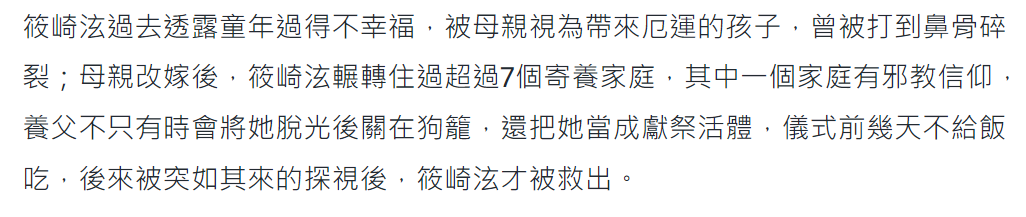 女星筱崎泫从小遭逢母亲家暴,被打到鼻骨絮叨,母亲再醮之后,更是干脆毁掉男儿,筱崎泫也因此投入寄养家庭,被保母侍奉。